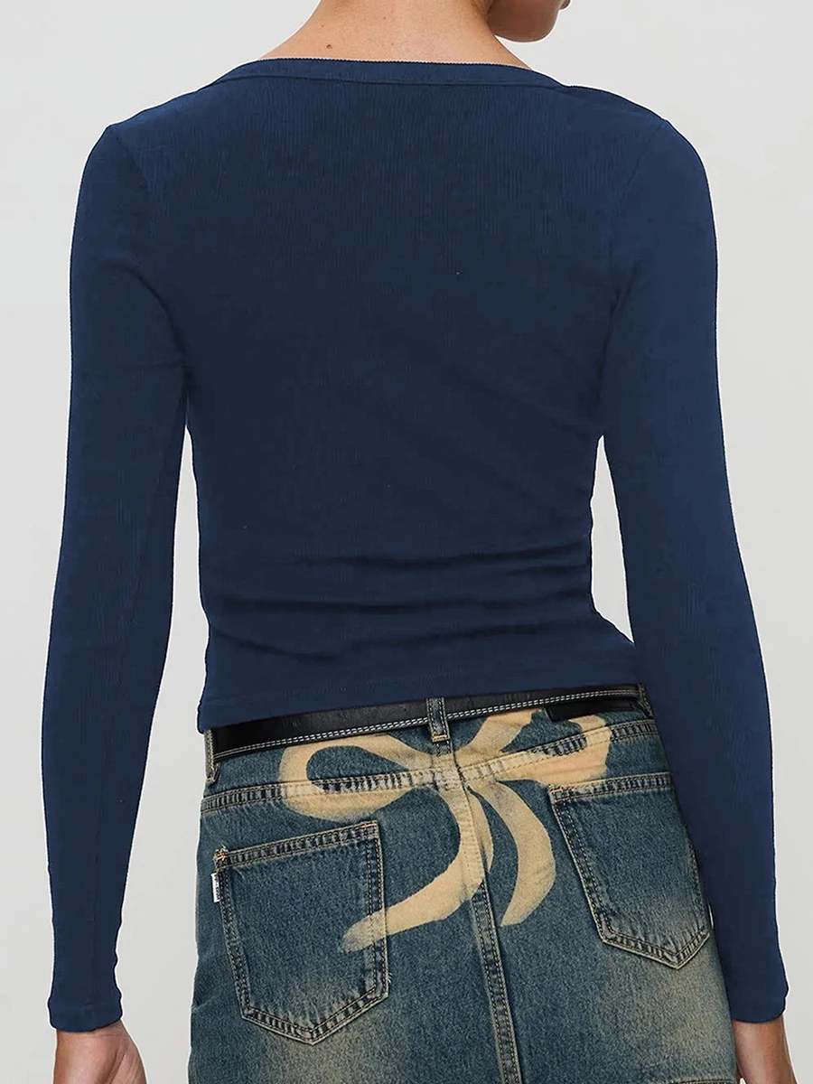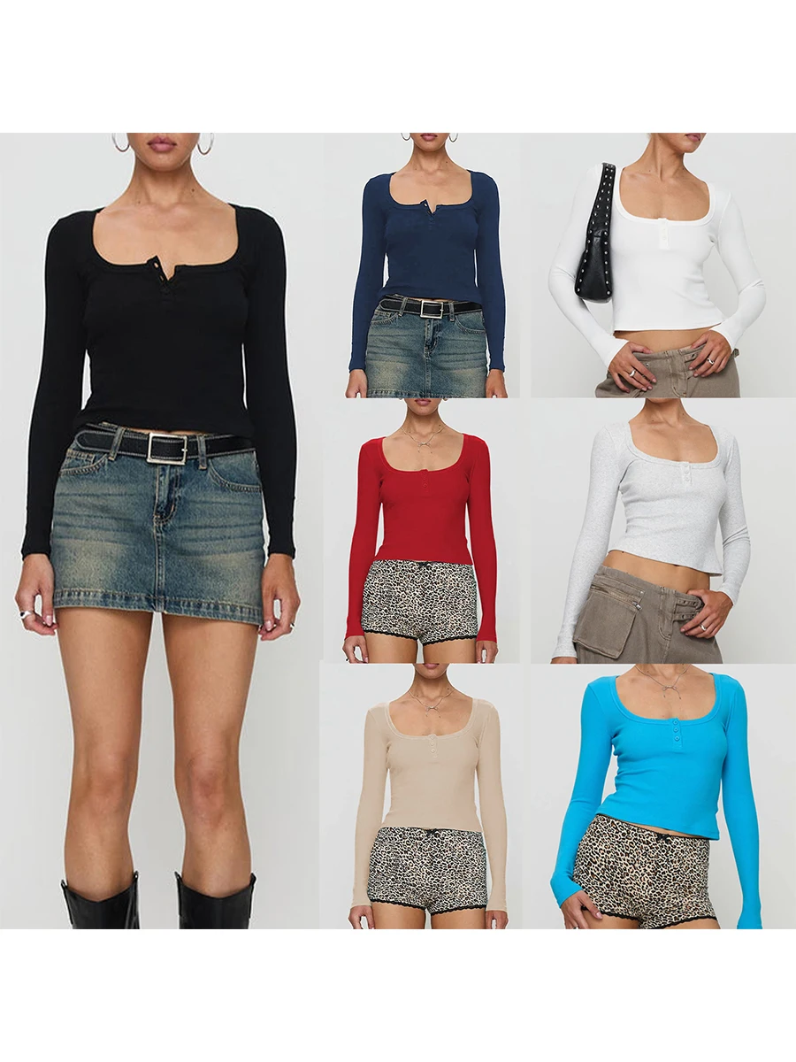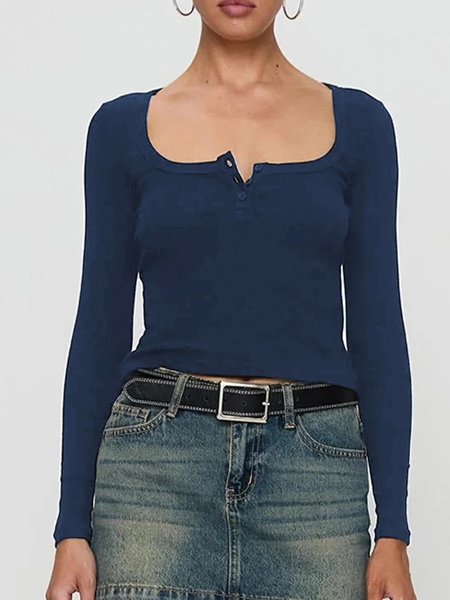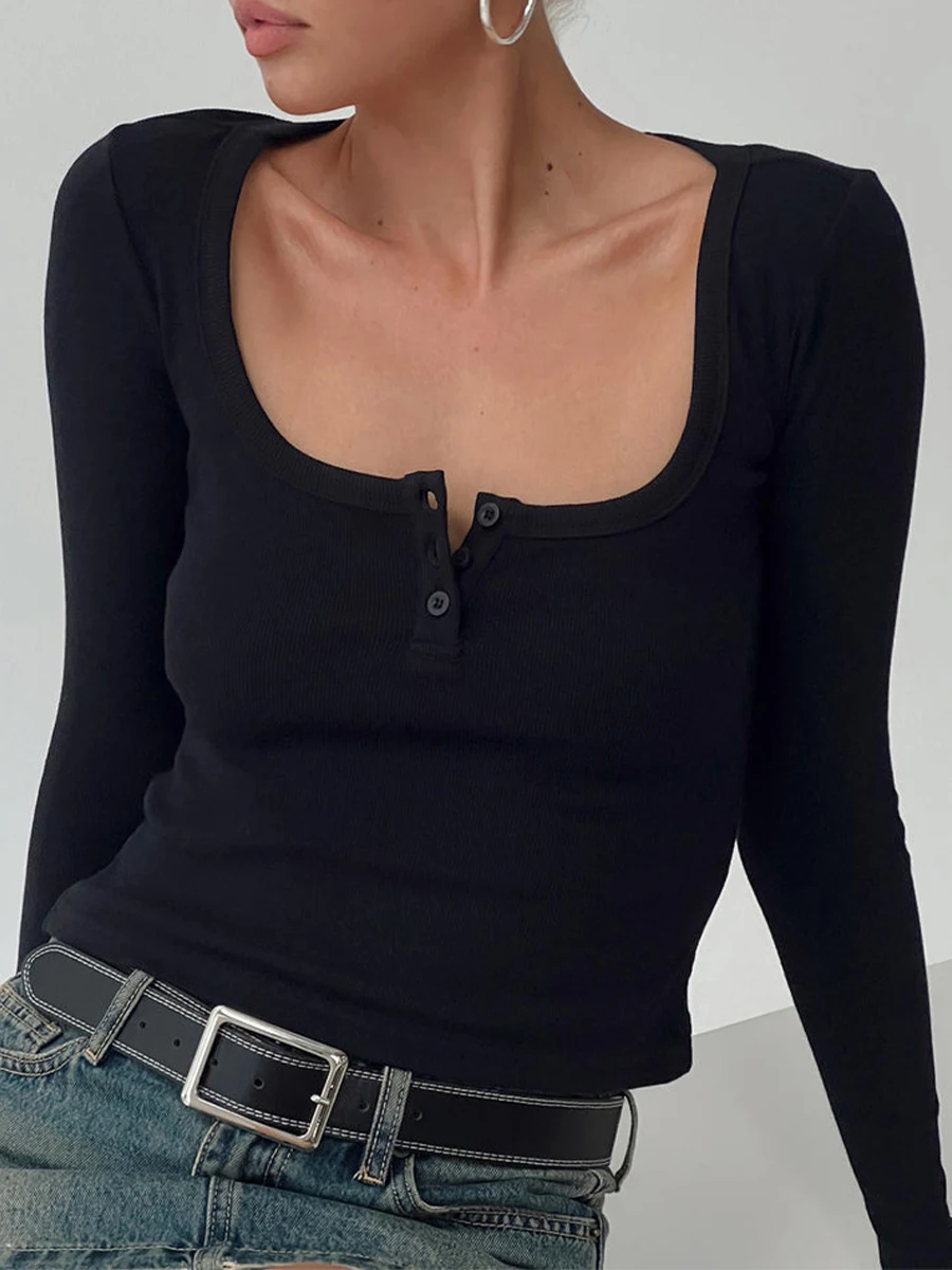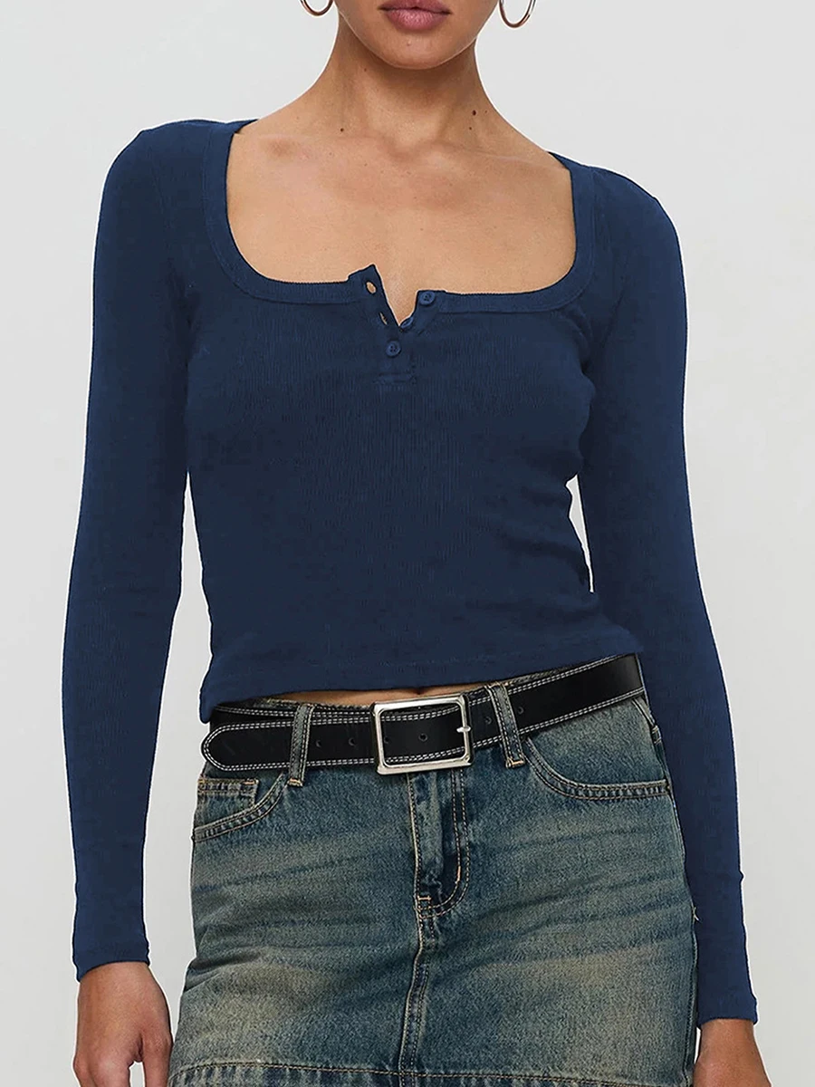Women Crop Fitted Tops Trendy Solid Color Square Neck Button Long Sleeve Henley Shirt for Club Streetwear