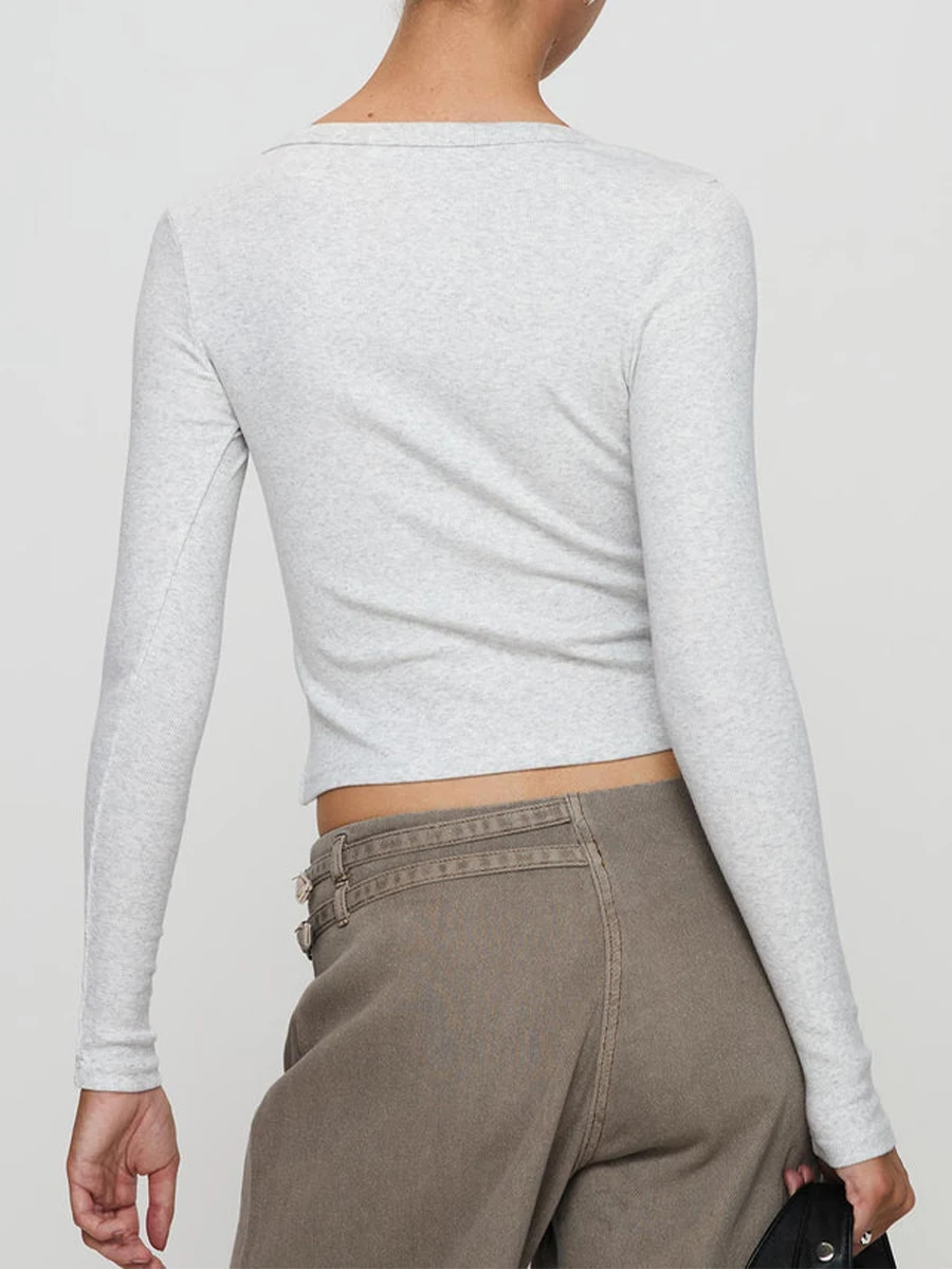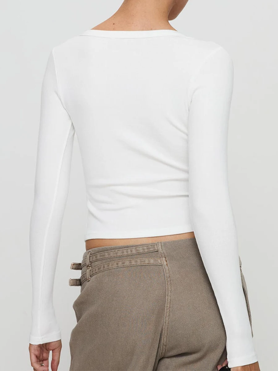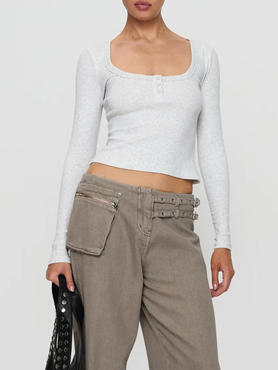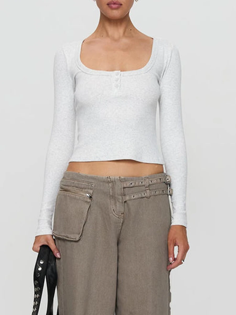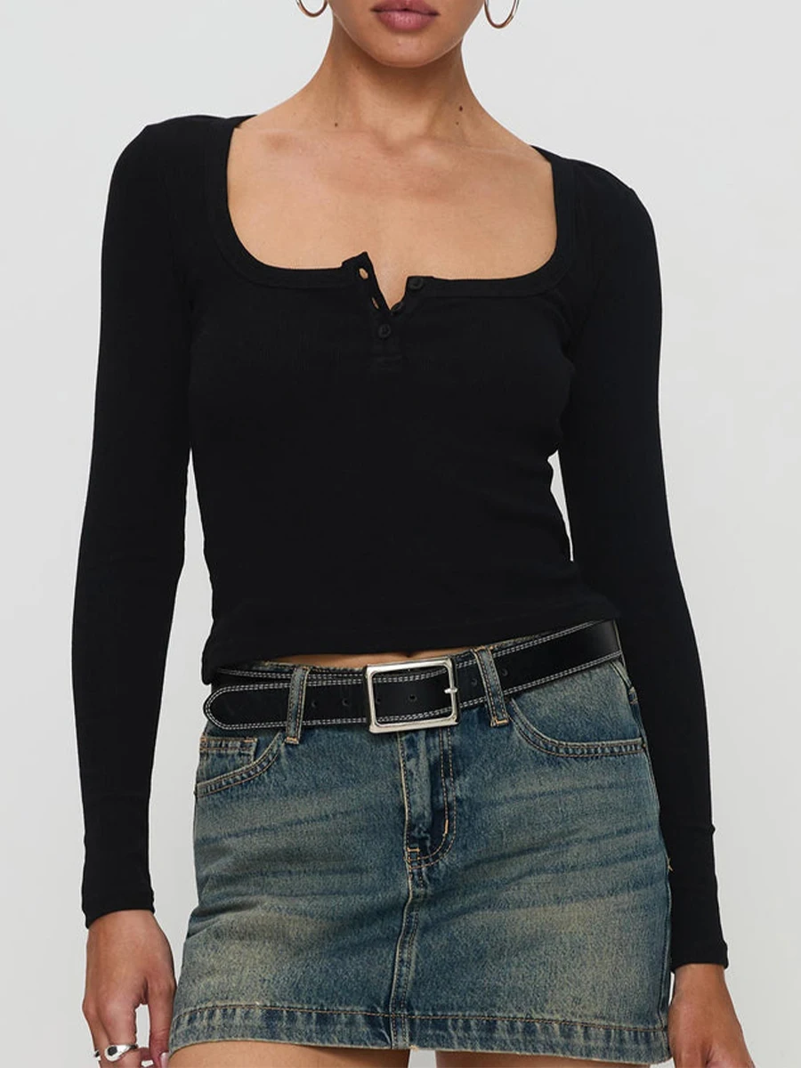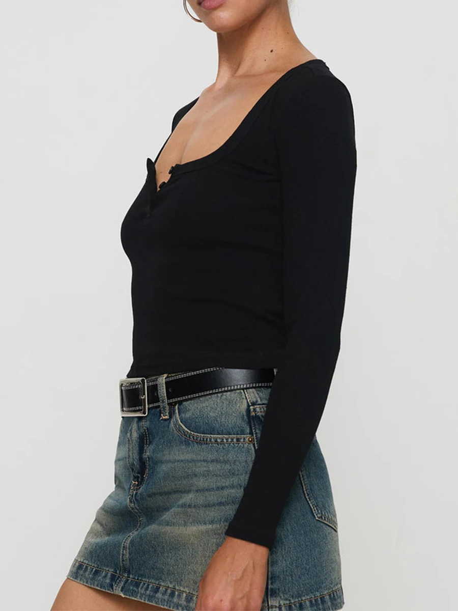 Women Crop Fitted Tops Trendy Solid Color Square Neck Button Long Sleeve Henley Shirt for Club Streetwear