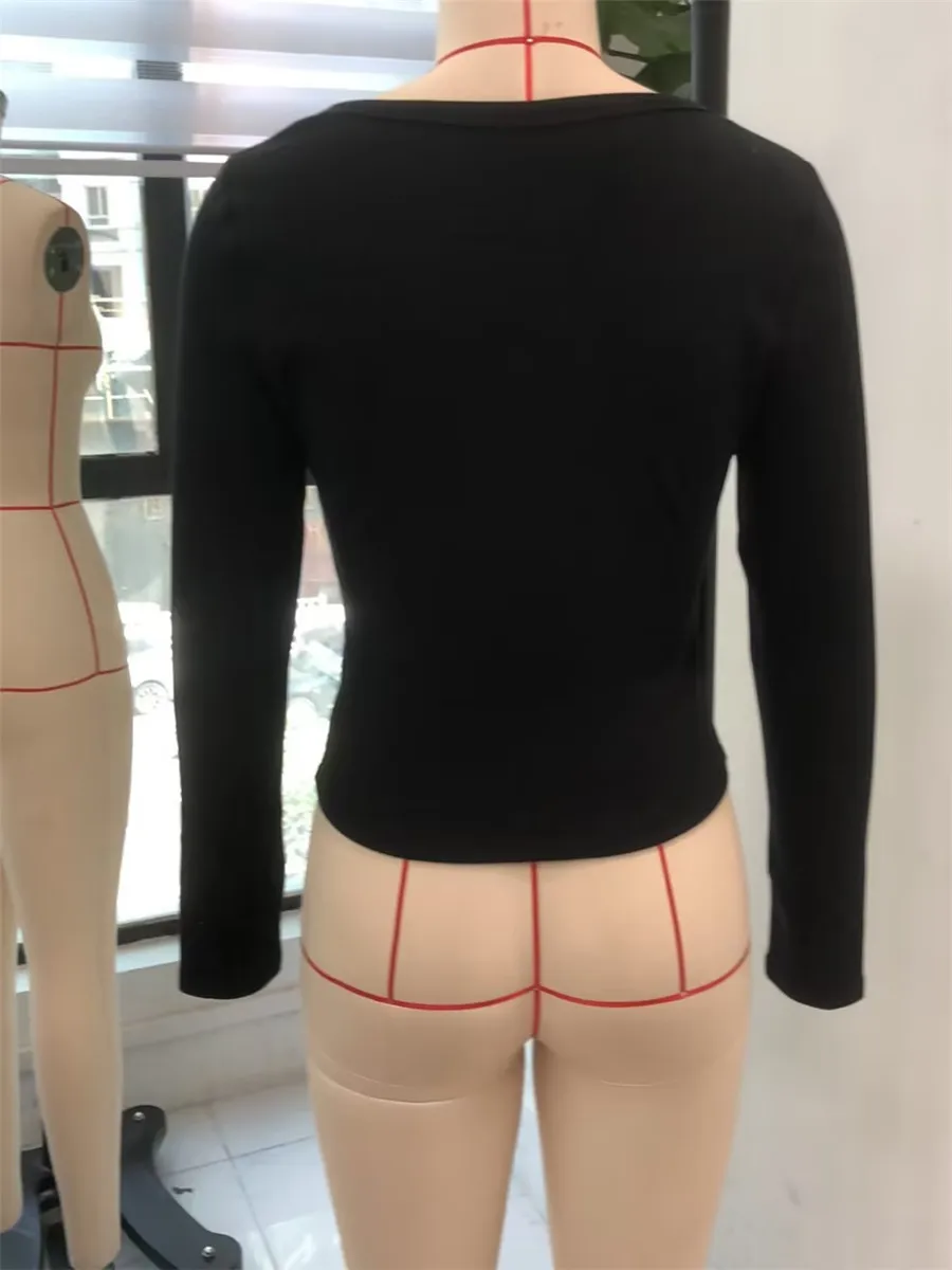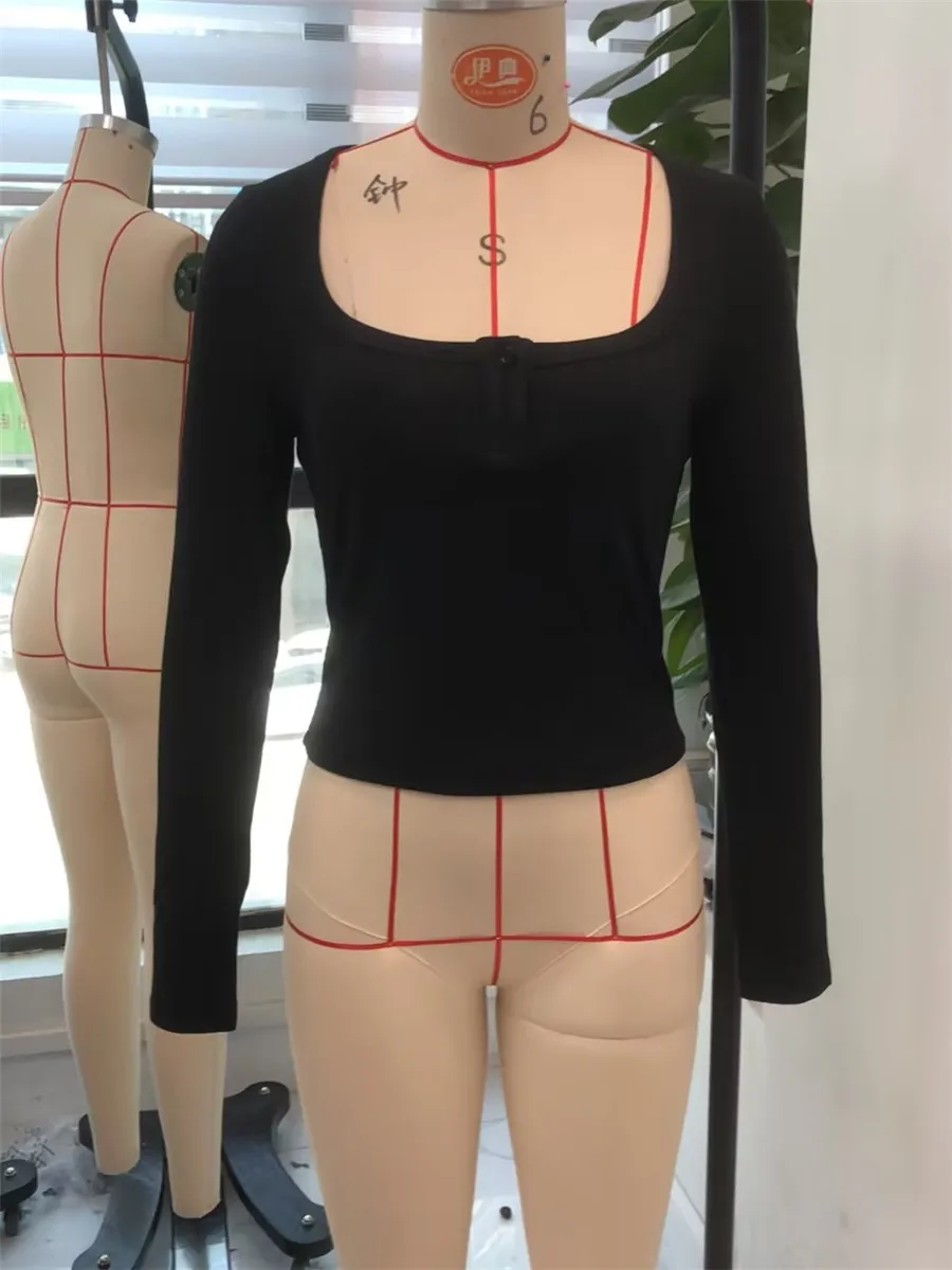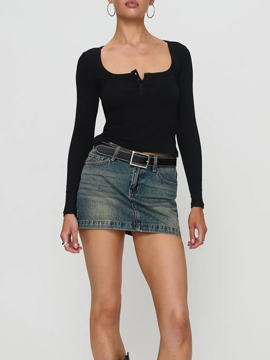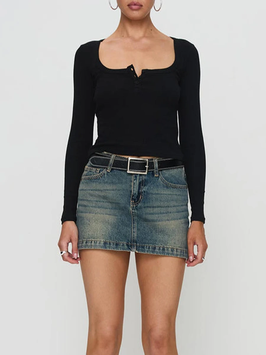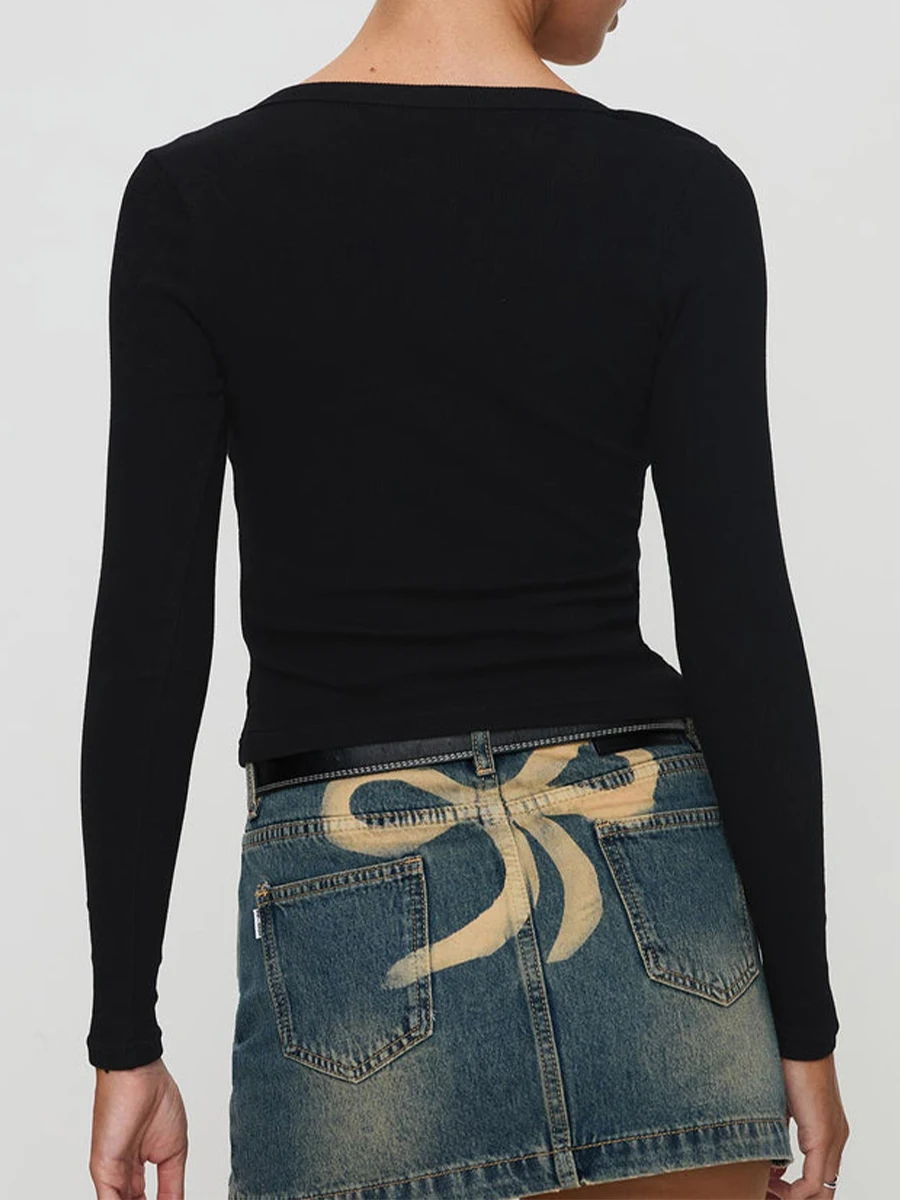 Women Crop Fitted Tops Trendy Solid Color Square Neck Button Long Sleeve Henley Shirt for Club Streetwear