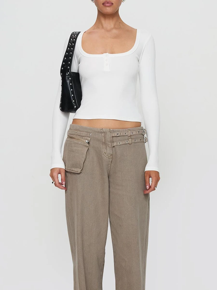Classic solid color, button detail, square neck, long sleeves, slim fit, crop length; Fitted crop tops for women; Dressy crop tops for women; Henley shirts for women, fashionable and unique streetwear to make you more attractive