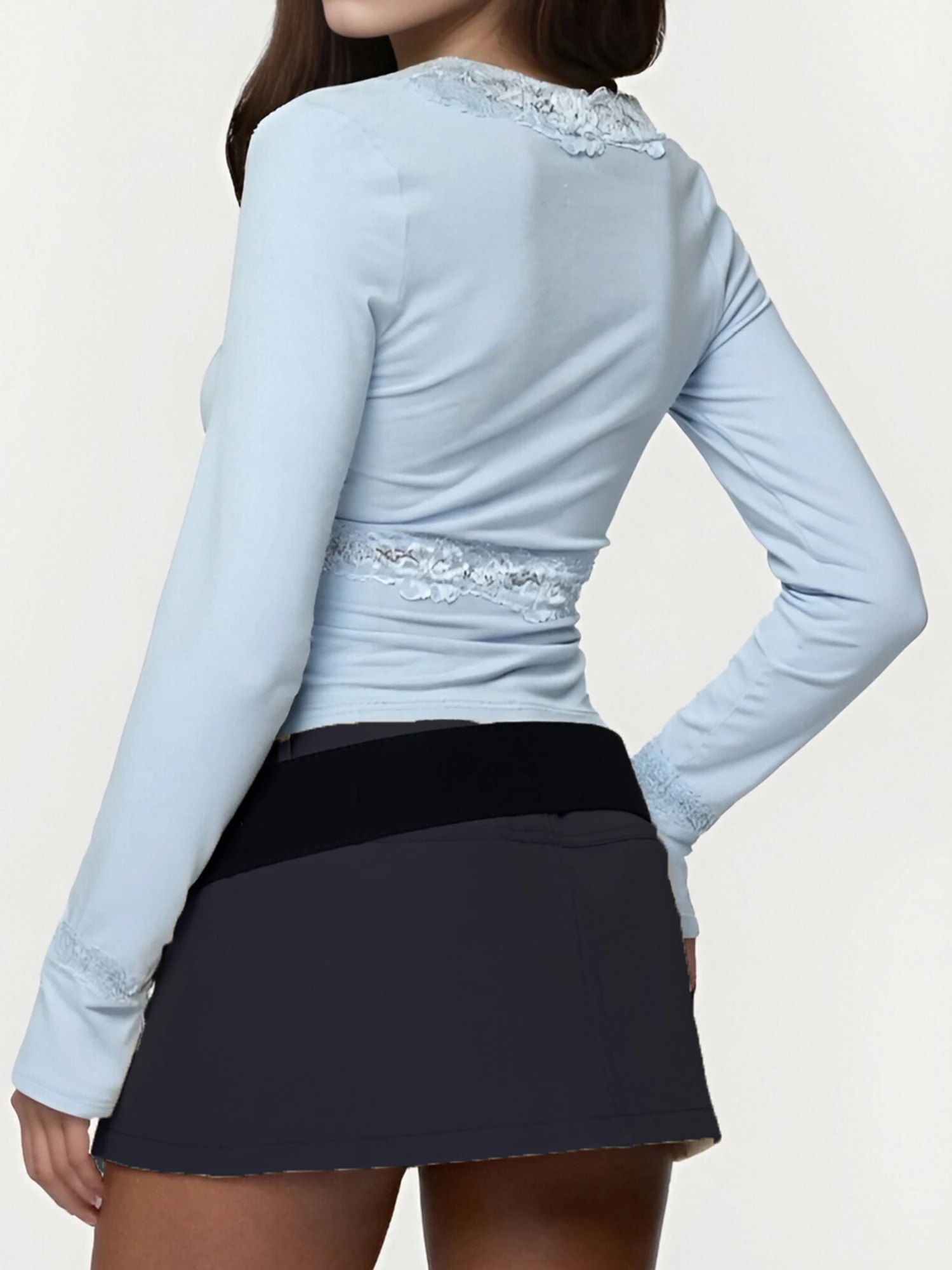 Women s Spring Summer V Neck Tops Blue Long Sleeve Lace Trim Fit Party Blouse