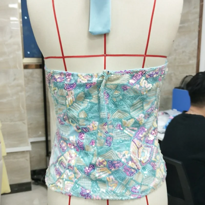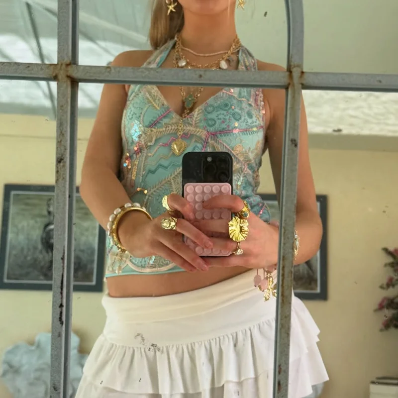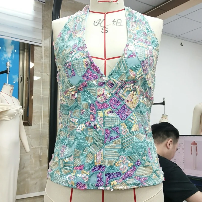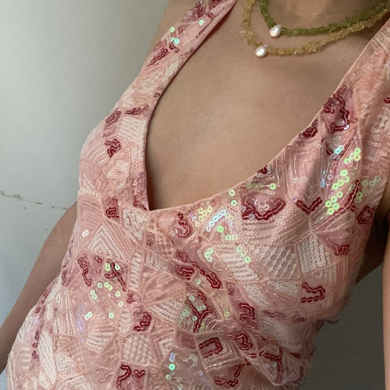 Y2k Aesthetic Sequin Beaded Tank Tops for Woman Sleeveless Halter Neck Crop Vest V Neck Backless Cami Tops Streetwear Going Out